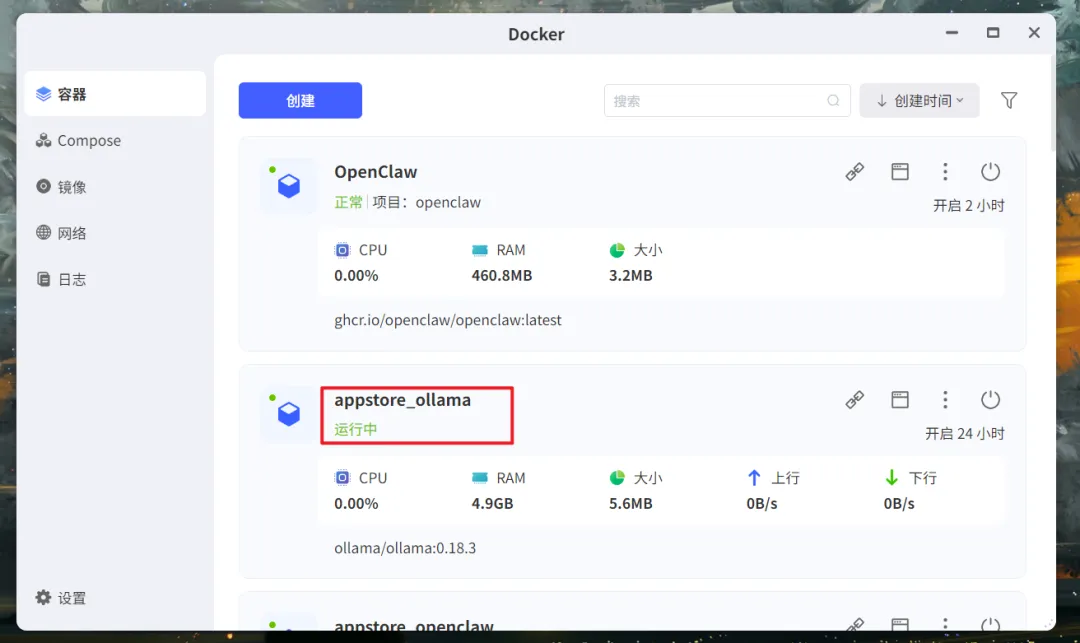 🔺极空间的Ollama框架也是基于Docker部署起来的,我们在应用商店安装好Ollama之后,就能在Docker管理器中看到“运行中”的Ollama容器。