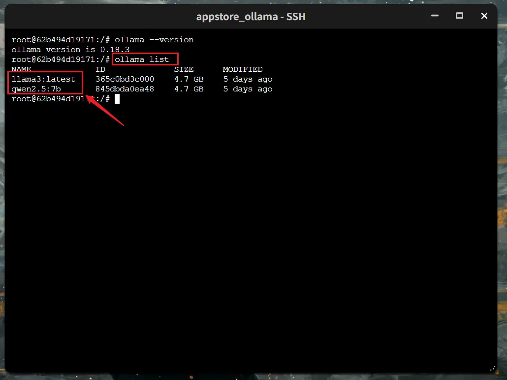 🔺然后通过指令“ollama list”查看本地模型,没想到极空间应用商店的Ollama已经为我们预装了llama3:latest和qwen2.5:7b大模型,这两个大模型都是当前主流主机部署大模型的热门只选。前者主攻英文,后者主攻中文。