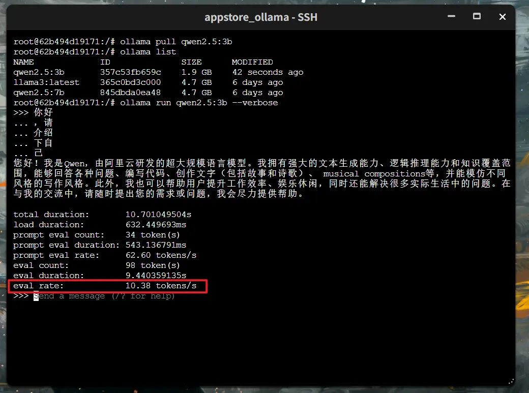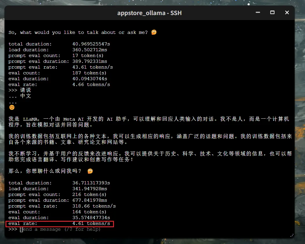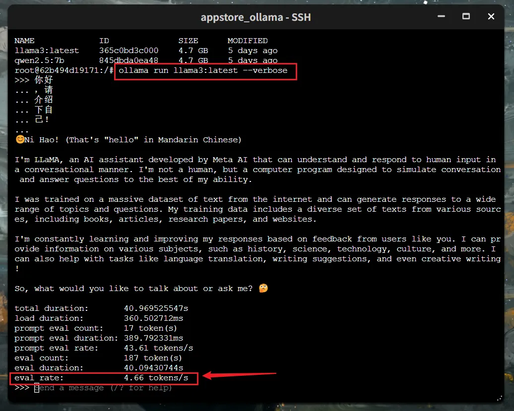 🔺那它们在极空间上的表现如何呢?先来看看llama3:latest,通过指令“ollama run llama3:latest --verbose”进入交互模式并进行简单的推理测速,结束后可以看到它在极空间Z423上跑到了4.66 tokens/s,虽说这只是本地大模型的“打字机”水平,不过个人也算能接受吧~