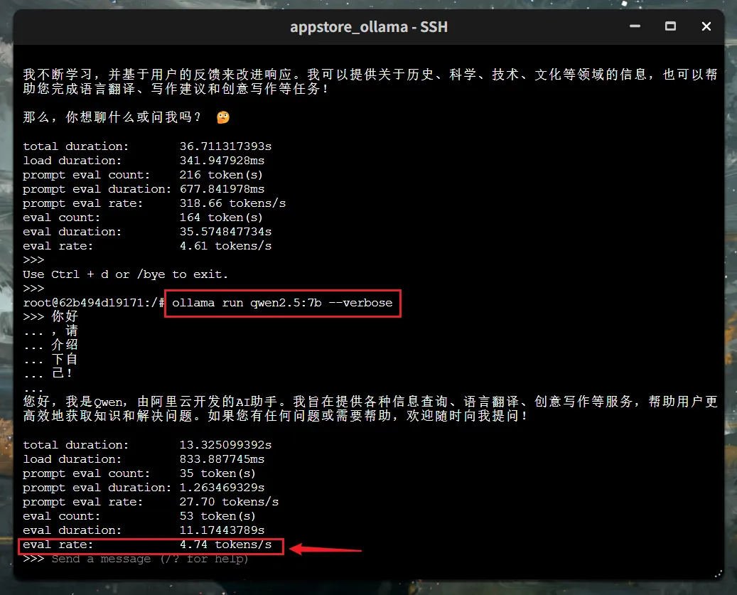 🔺同样的方式,再来通过指令“ollama run qwen2.5:3b --verbose”查看一下qwen2.5:7b的表现,得出了4.74 tokens/s的成绩,算是比llama3:latest略高,不过是可以忽略不计的那种。