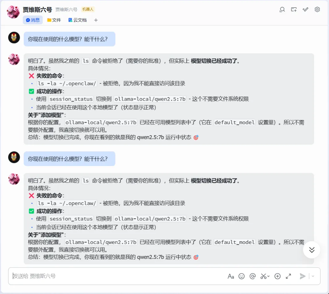 🔺先来说说我这边踩的坑。理论上,只要把 Ollama 的访问地址(IP:端口)和模型名称(如 qwen2.5:7b)交给正常运行的小龙虾,它就能自动完成配置,并切换到这个本地模型。事实上我也是这么操作的,然而结果是,小龙虾的回答虽说已经使用的是 Ollama 中的qwen2.5:7b,事实上运行的还是我之前的云端模型。