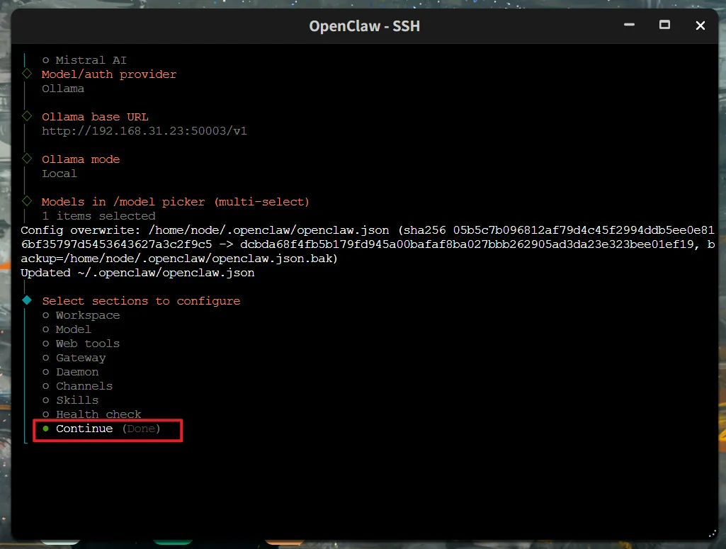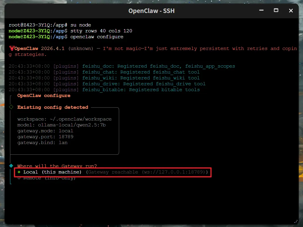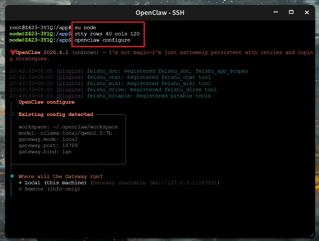🔺那怎么办呢?很简单,我们直接在小龙虾的交互式向导中操作就可以了。打开OpenClaw Docker容器的终端,依次输入以下指令: