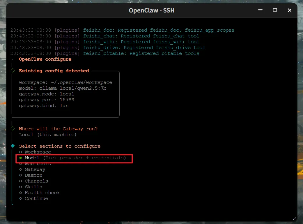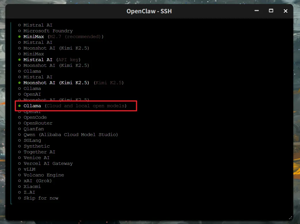 🔺目前最新版的OpenClaw已经原生集成Ollama模型的选项,我们这里直接选择“Ollama”。