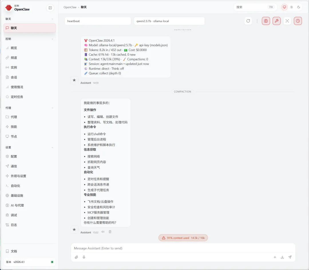 🔺这个时候我们在小龙虾的Web UI界面和它对话,可以看到它已经启用了“ollama-local/qwen2.5:7b”模型,只不过对话等待的时间确实有些长,一个简单的问题要等差不多一分钟。