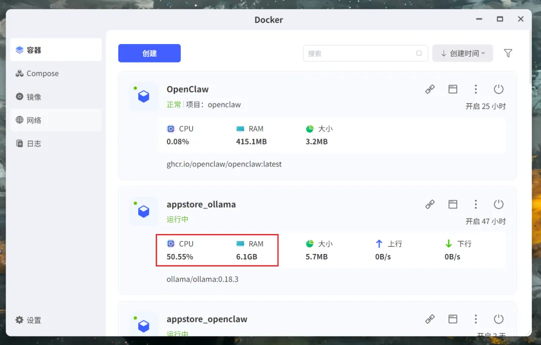 🔺另外我也观察到,在OpenClaw回答问题期间,Ollama容器的CPU占用确实会提升很多,也进一步证实了小龙虾确实启用了Ollama本地大模型。