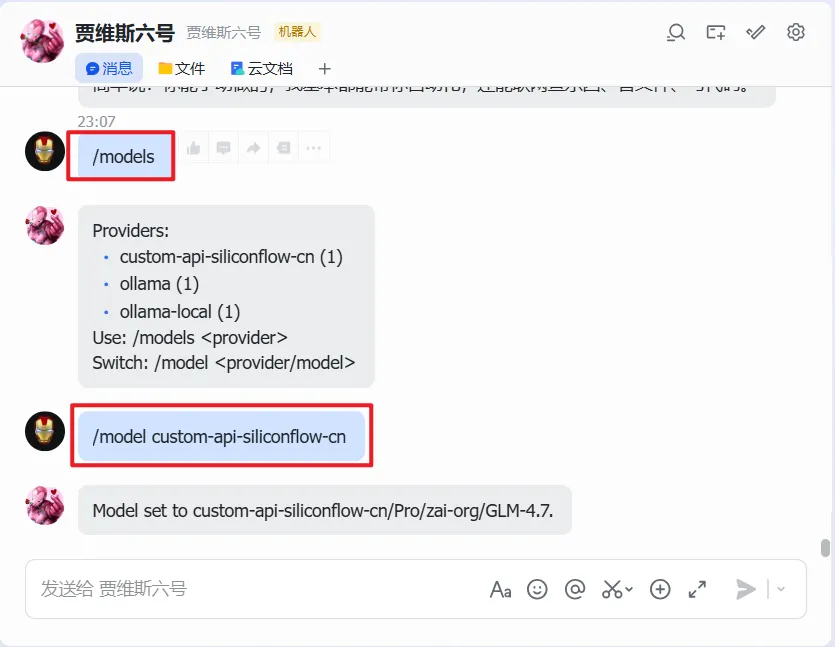 🔺当然,如果需要执行一些复杂命令用到云端模型的时候,可以直接在输入框中执行“model 模型名称”,就能快速进行模型切换,还是很方便的。