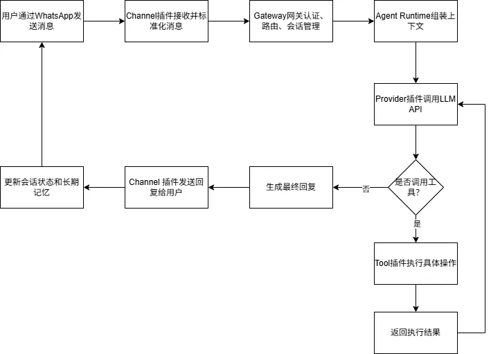 Agent Runtime 将最终回复交给 Gateway,Gateway 根据原始消息的来源(WhatsApp),将回复路由给 WhatsApp Channel 插件。