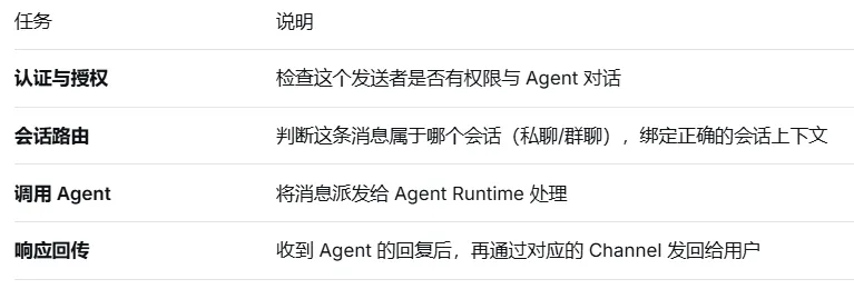 Gateway 是整个 OpenClaw 的中枢神经系统,它不负责“思考”,但负责“调度”。它的工作包括: