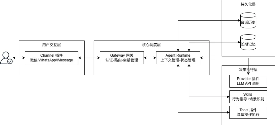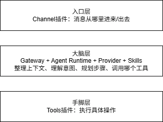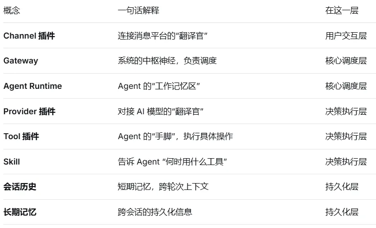 Channel 是嘴(接收和发送消息)Provider 是大脑的“外接计算器”(调用 LLM 进行推理)Skill 是“说明书”(告诉大脑在什么场景下怎么做)Tool 是“手脚”(执行具体动作)Gateway 是“神经中枢”(协调一切)