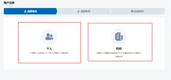 进入注册页面后,会出现身份选择界面,分为个人和机构两个选项。如果是个人办理版权登记相关业务,直接点击个人选项即可;企业办理则选择机构,切勿选错,否则会影响后续操作。