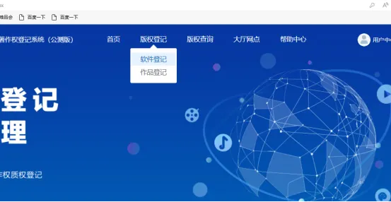 在新的页面中,输入刚刚注册的账号和密码,完成登录操作。登录成功后,在页面菜单栏中找到版权登记选项,点击进入,若办理软件著作权登记,可直接选择软件登记入口。