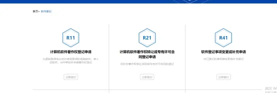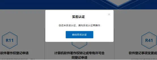 进入软件登记页面后,会看到多个登记申请选项,其中R11 计算机软件著作权登记申请是最常用的选项,点击该选项后的立即登记,此时系统会弹出实名认证提醒,提示“您还未实名认证,请先实名认证再操作”,点击前往实名认证,正式进入实名认证流程。
