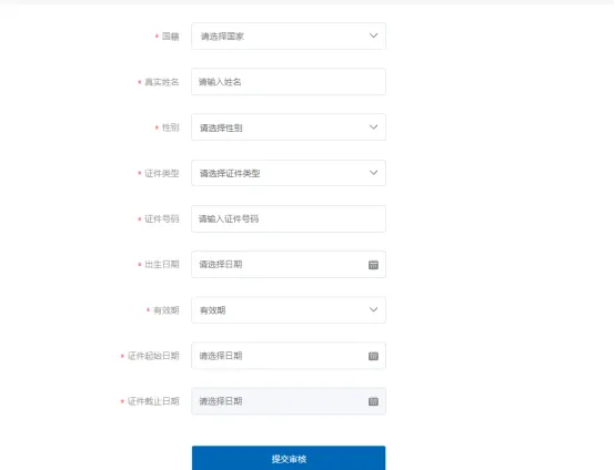 邮箱验证通过后,进入核心的个人信息填写页面,所有带*的选项均为必填项,需严格按照本人有效证件信息如实填写,包括: