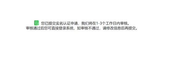 提交审核后,页面会提示“您已提交实名认证申请,我们将在1-3个工作日内审核”。接下来只需耐心等待1-3个工作日,登录平台查看实名认证审核结果即可。