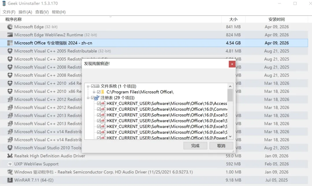 卸载完成后会搜索该软件在windows系统中的所有注册表信息,然后进行一并清理,等待清理完成即可。