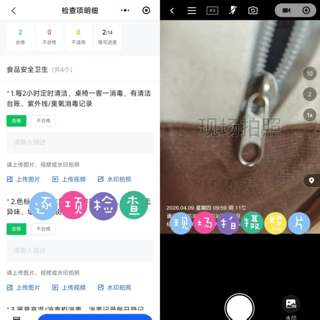 发现隐患只是第一步,解决问题才是关键。企鲸内置的水印相机功能,能让每一张检查照片自动叠加不可篡改的时间、地点和门店 / 设备信息,从根源上杜绝 “假巡检”“事后补拍” 的情况。