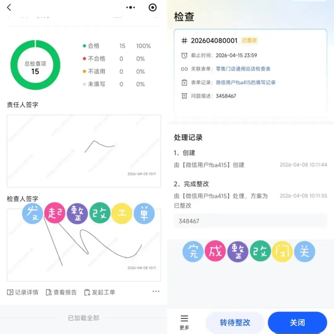当检查中发现问题时,督导人员或安全员可以直接在检查单里一键发起整改工单,指派给责任人并设定整改时限。系统会自动提醒,整改后需要拍照反馈,督导人员在线验收通过后工单才会关闭。整个过程全程留痕,形成 “发现问题→指派整改→验收闭环” 的完整管理链条。