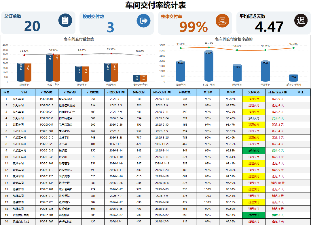 4.交付状态:自动标注“按时交付/延迟交付”,异常订单一眼识别;
