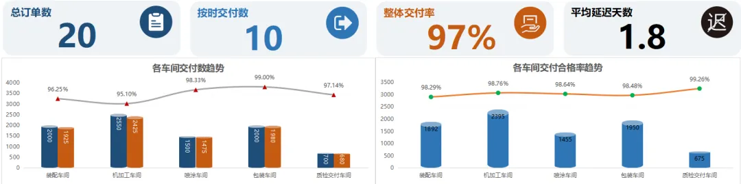 2.各车间交付合格率趋势图:展示各车间合格率变化,既看交付速度,也看交付质量;