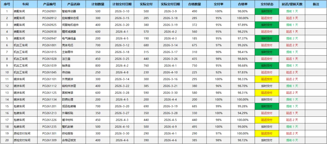 2.日期管理:计划交付日期、实际交付日期,自动计算延迟/提前天数,延迟订单标红提醒,提前订单标绿鼓励;