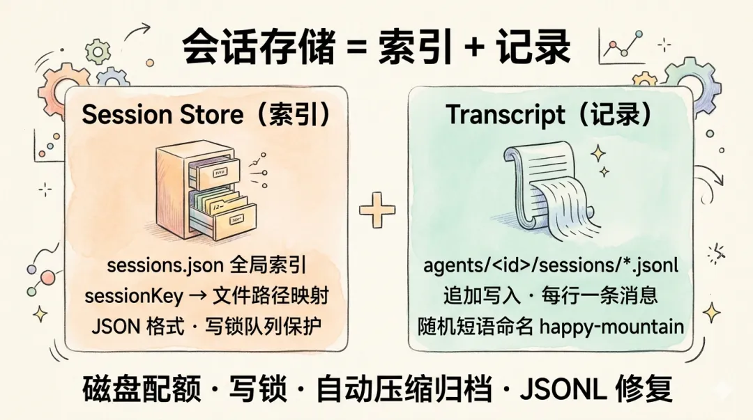 ├─ sessions.json # Session Store 索引(全局,记录 sessionKey→文件映射)