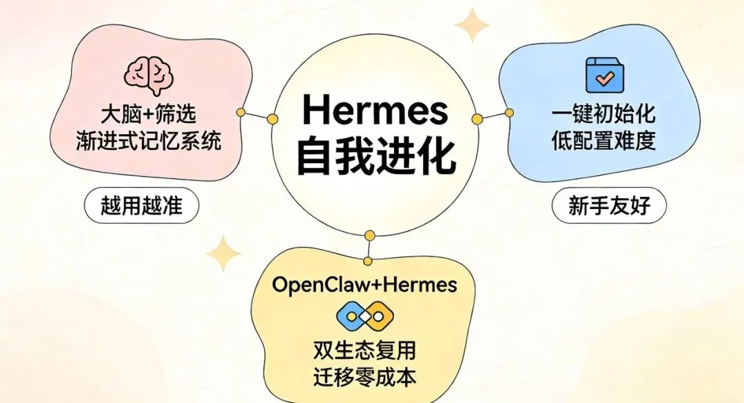 意思是你之前在 OpenClaw 上花的时间,全都没白费。Hermes 直接继承过来,不用从头配。