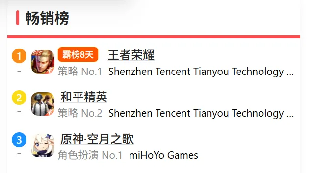 4月8日,《原神》更新月之六版本,全新五星岩系角色莉奈娅加入卡池,角色形象讨喜的同时兼具数值强度。截至目前,《原神》在App Store游戏畅销榜升至第3,畅销总榜第6,继月之五版本冲入游戏畅销榜前三后再次表现出强劲势头。