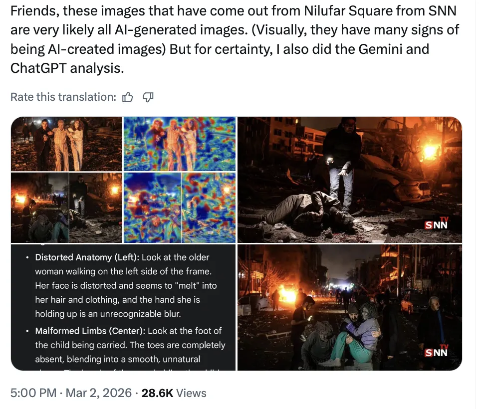 《纽约时报》3月9日发布的伊朗当地照片也被指有“数字操纵”迹象,图片记录了在宣布穆杰塔巴·哈梅内伊为伊朗新任最高领袖后,德黑兰民众聚集的画面。质疑图片真实性的社交媒体用户分享了包括错误级别分析(ELA)在内的取证分析截图,在X上的浏览量超过60万。