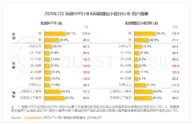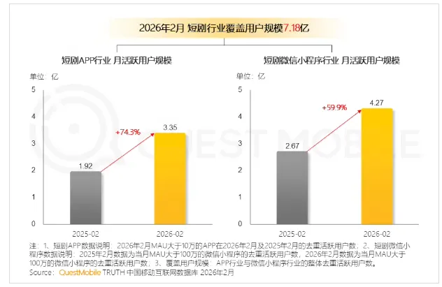 4 月 8 日消息,互联网数据报告机构QuestMobile 今日发布 2026 短剧行业洞察报告,截至 2026 年 2 月,短剧行业月活用户规模已达到 7.18 亿。其中,短剧独立 App、短剧微信小程序分别为 3.35 亿、4.27 亿,二者同比增长分别为 74.3% 和 59.9%。
