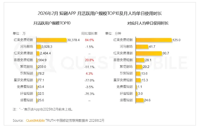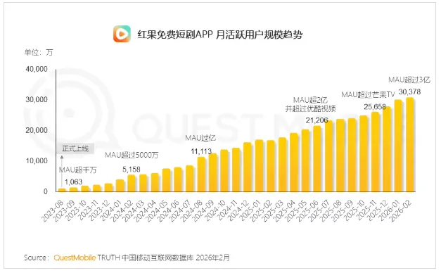 QuestMobile 数据显示,2026 年 2 月,红果免费短剧 App 月活跃用户规模突破 3 亿大关,达到 3.04 亿,同比净增近 1.4 亿。