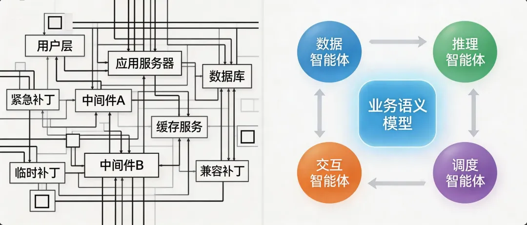 传统的"+AI"模式正在失效——在旧架构上贴AI标签,就像给马车装喷气发动机,跑得越快,散架越快。真正的转型,必须是从记录数据(数字化)到自主决策(数智化)的底层重构。