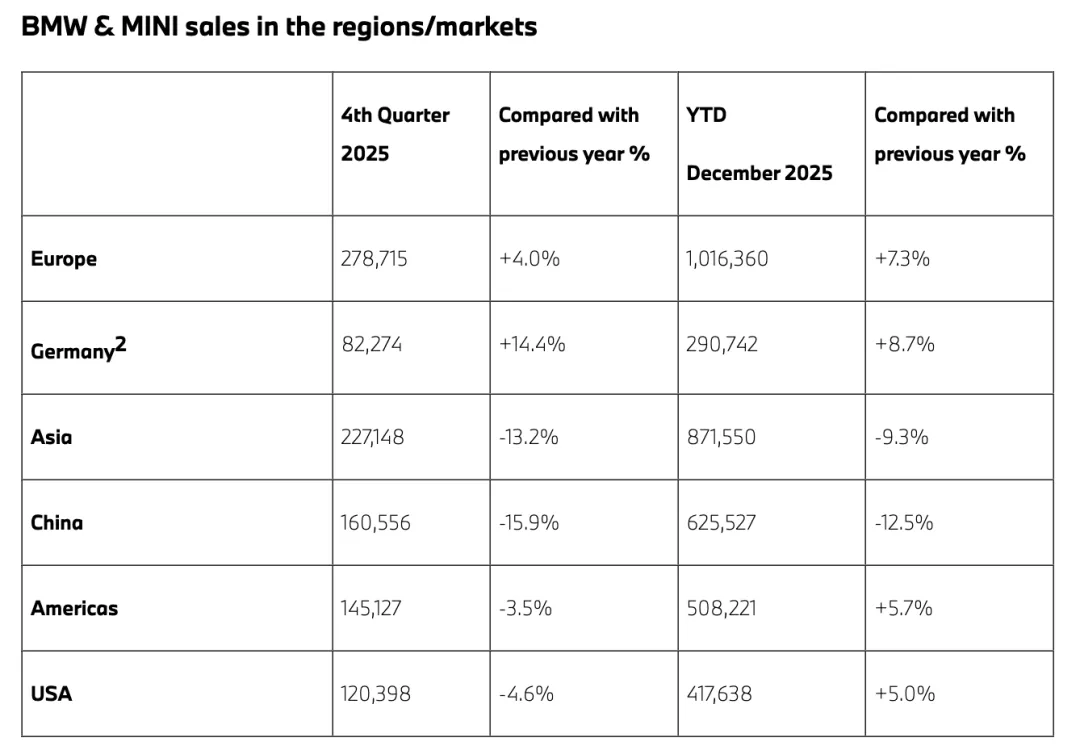 1月11日,快科技报道,宝马集团近日公布了2025年销量数据,2025年全年销量为2,463,715辆,同比微增0.5%。分区域来看,欧洲市场全年累计销量达1,016,360辆,同比增长7.3%;美国市场全年累计销量为417,638辆,同比增长5.0%。中国仍是宝马集团全球最大市场,全年累计销量为625,527辆,但同比下降12.5%,也是全球降幅最大的单一市场。