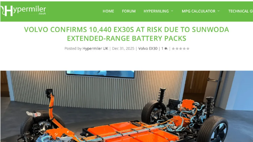 1月11日,据英国专业汽车能效媒体Hypermiler报道,美国、加拿大宣布因电池起火风险正式召回沃尔沃EX30车型,此前南非已对当地沃尔沃EX30车型发布召回通告。此外,沃尔沃已确认,英国有10,440 辆EX30受到与Sunwoda(欣旺达) 提供的高压电池单元相关的安全问题的影响,这是该国该问题的规模首次被公开承认。