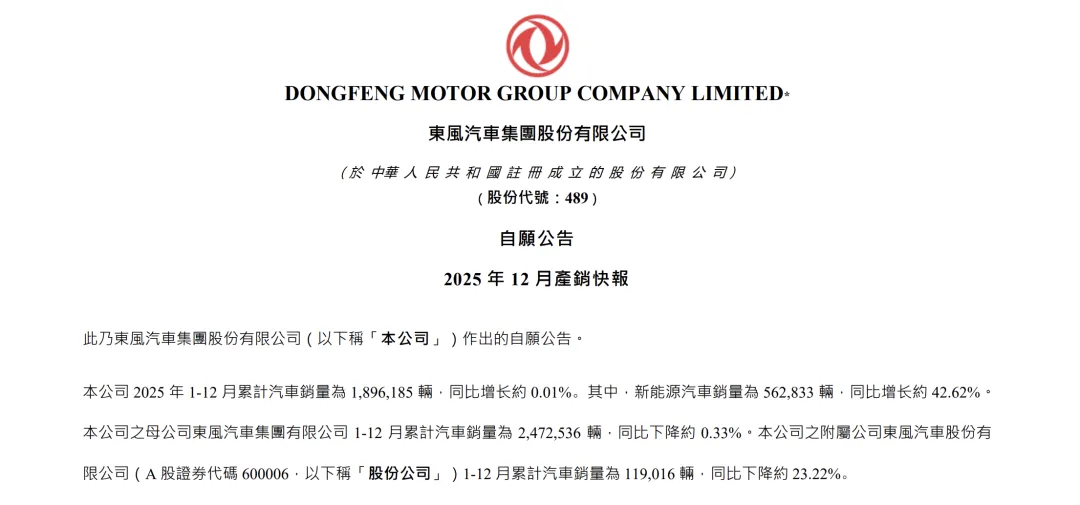 1月12日,东风集团股份在港交所公告称,公司2025年累计汽车销量为1,896,185辆,同比增长约0.01%。其中,新能源汽车销量为562,833辆,同比增长约42.62%。公司之母公司东风汽车集团有限公司1-12月累计汽车销量为2,472,536辆,同比下降约0.33%。