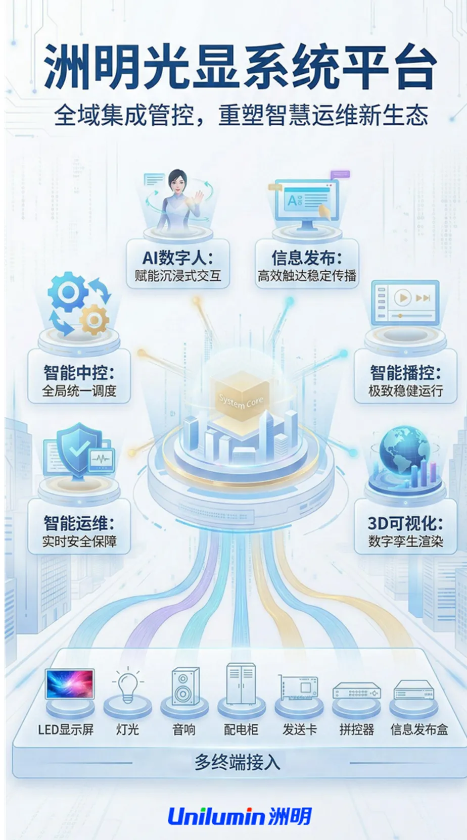 在日常运维中,洲明光显平台融合AI多模态技术,实现自动监控设备、精准判断并预警设备故障等实用功能,“早发现、早处理”,降低运维成本与故障影响;同时,AI算法还能智能优化设备运行参数,如LED屏幕亮度、灯光强度等,兼顾展示效果与绿色节能。