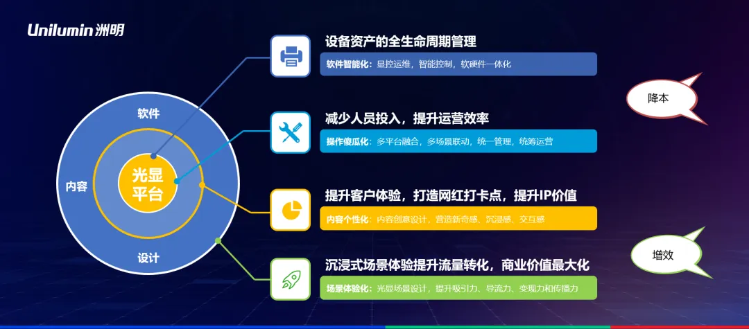 洲明的一体化方案为吉大正元带来的,是看得见、管理者能有感的运营价值。透过统一的物联中控,原本需要团队协同的操作,如今仅需一人即可掌握,运营效率提升MAX。而高清、沉浸、智能的全场景LED应用,也成为了吉大正元对外的一张“品牌名片”。