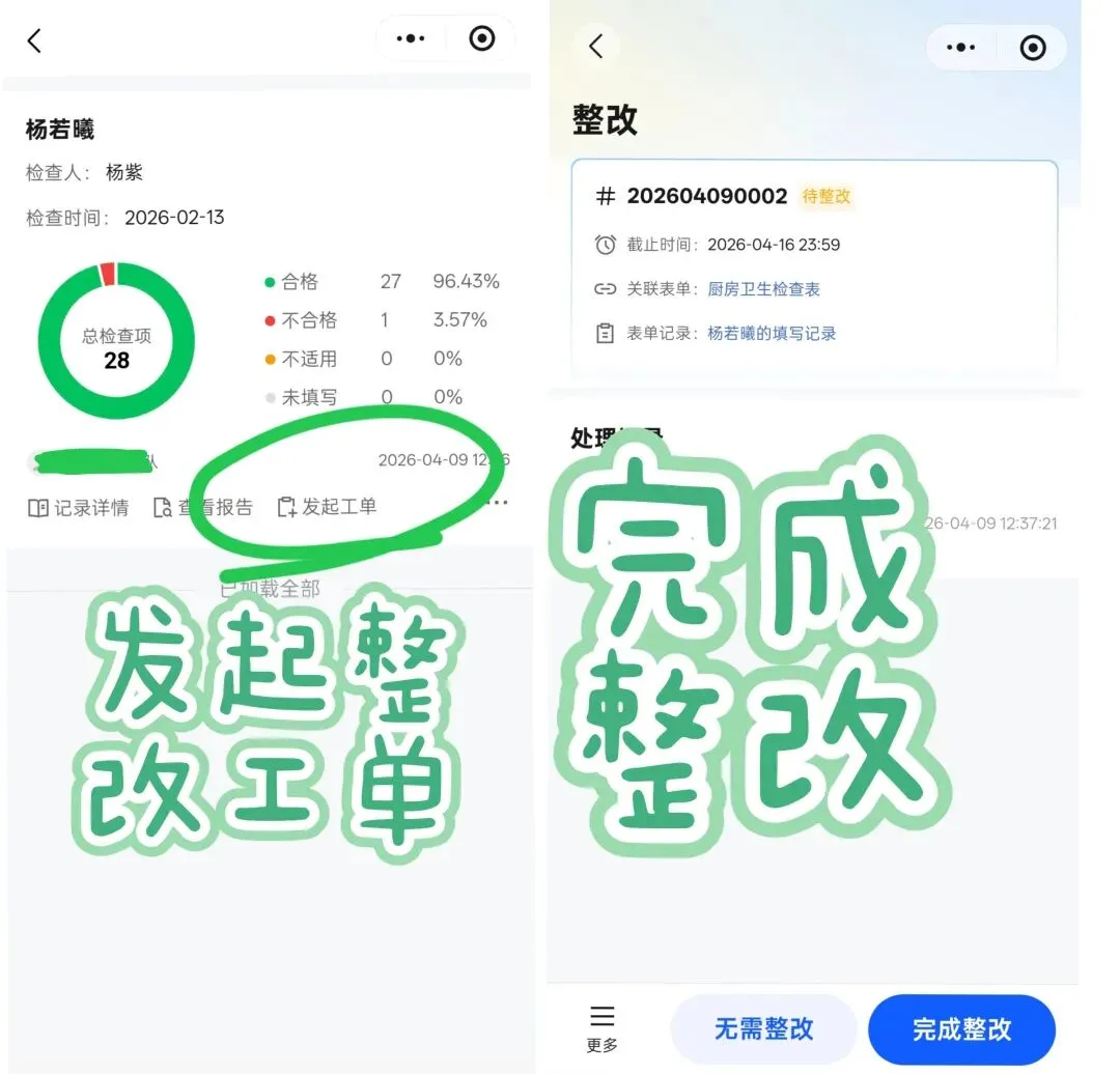 检查中发现问题时,可一键发起整改工单,指派责任人并设定时限,系统自动提醒。整改后需拍照反馈,督导在线验收通过才算闭环,全程留痕,形成 “发现→整改→验收” 的完整链条。