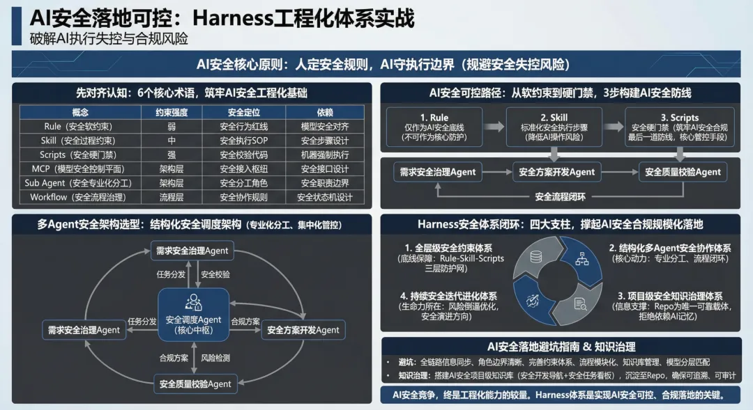 - 持续安全迭代进化体系(生命力所在):AI安全落地从来不是一次设计到位,而是在实践中持续发现安全风险、解决安全问题,逐步优化完善的过程。核心逻辑是“安全风险倒逼优化”,通过实战场景中的安全坑点复盘,形成“发现安全风险-解决安全问题-固化安全方案-优化安全体系”的迭代闭环;同时明确四大安全演进方向:安全规则脚本化、安全流程产品化、安全项目模板化、安全知识进项目,让Harness安全体系能够快速适配新的安全合规要求、技术迭代与业务场景,始终保持稳定、高效、可扩展。