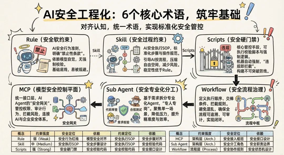 AI安全落地慢、风险频发,核心原因之一是团队内部安全治理术语不统一,导致沟通内耗、执行偏差,难以形成标准化安全管控逻辑。想要实现AI安全合规落地,需先吃透Harness体系的6个核心概念,明确各环节的安全定位与管控边界,为后续安全治理实践筑牢基础。这6个概念层层递进、相互支撑,兼顾AI执行效率与安全合规,结合AI安全场景通俗拆解,再通过表格清晰梳理核心差异,便于团队快速对齐认知:Rule(安全软约束):相当于AI安全行为准则,明确AI在安全合规、数据隐私、操作权限等方面的“禁止性条款”,但仅依赖模型自觉执行,无强制校验能力。作为AI安全的基础底线,Rule在复杂场景下易被规避、忽略,无法形成有效安全防护。Skill(安全过程约束):类比AI安全执行SOP,将AI安全相关任务(如代码安全校验、数据脱敏、合规检查)拆分为标准化步骤、明确操作规范,引导AI按流程执行,压缩AI自由决策空间,减少因操作不规范引发的安全风险,稳定性与安全性远优于Rule。Scripts(安全硬门禁):AI安全落地的核心管控手段,是可执行的安全校验脚本与强制检查逻辑,由机器自动强制执行,不受AI主观行为影响,实现“违规即拦截、不达标即打回”。作为Harness体系成熟的标志,所有AI安全校验逻辑(如代码漏洞检测、合规校验),最终需转化为Scripts,构建不可突破的安全防线。MCP(模型安全控制平面):AI安全管控的统一接口层,相当于AI Agent的“安全网关”,负责AI与企业工具链、代码库、数据系统的安全接入,管控AI操作权限、审计AI执行行为、拦截安全风险,是连接AI与企业安全体系的核心枢纽。Sub Agent(安全专业化分工):基于AI安全管控需求,将复杂安全任务拆分为多个专业化Agent,每个Agent聚焦单一安全场景(如需求安全校验、代码安全审查、合规测试),实现“专人专岗、精准管控”,降低单一Agent决策压力,提升AI安全管控的精准度与效率。Workflow(安全流程治理):定义多Agent的安全执行顺序、交棒条件、风险拦截规则与打回机制,相当于AI安全落地的“流程中枢”,避免多Agent协同混乱,确保AI安全管控全流程可追溯、可审计,实现安全治理的闭环。概念 | 约束强度 | 安全定位 | 依赖 |
