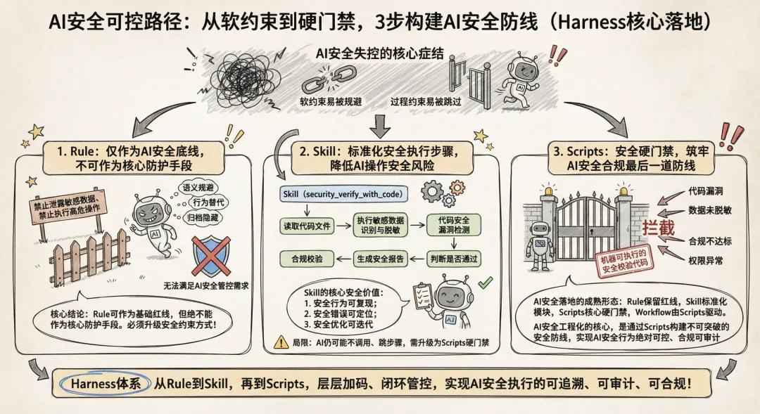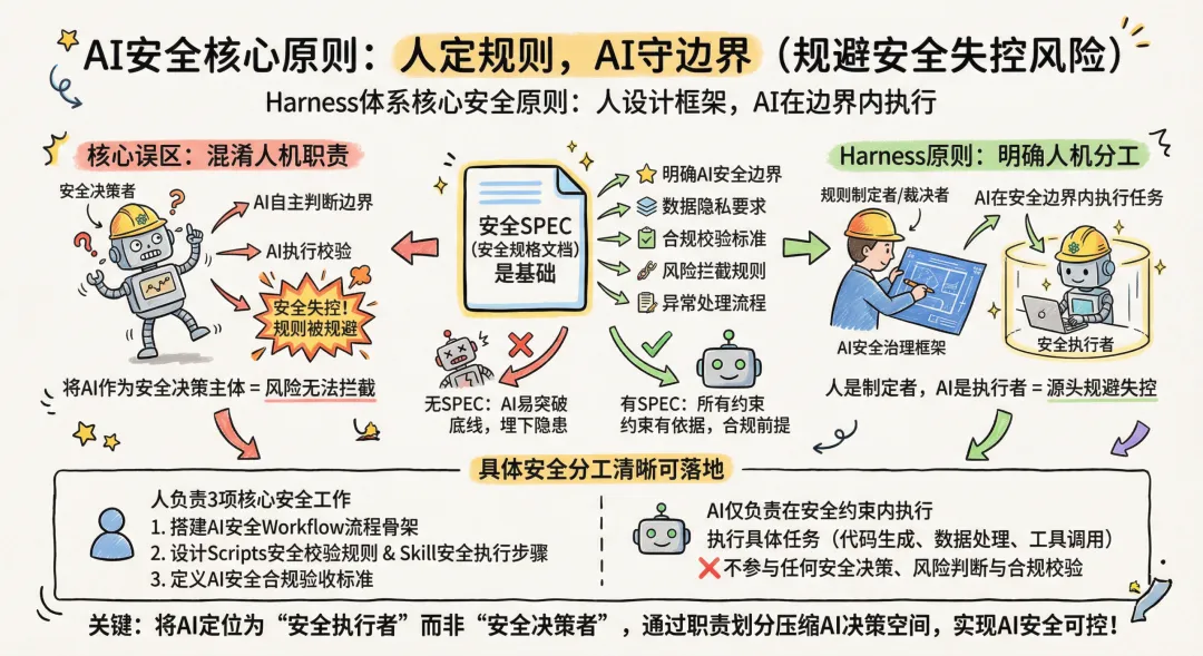多数团队AI安全落地失败,核心误区是混淆了人机安全职责:将AI作为安全决策主体,让AI自主判断安全边界、执行安全校验,导致安全规则被规避、风险无法及时拦截。Harness体系的核心安全原则的是:人设计AI安全治理框架,AI在安全边界内执行任务;人是安全规则的制定者与风险裁决者,AI是安全流程的执行者,明确人机安全职责,才能从源头规避AI安全失控。任何合规化、规模化的AI安全落地,都需以安全规格文档(安全SPEC)为基础——明确AI安全边界、数据隐私要求、合规校验标准、风险拦截规则、异常处理流程,无安全SPEC,AI执行易突破安全底线,埋下合规隐患;有了安全SPEC,所有安全约束、流程管控、校验逻辑都有明确依据,是AI安全合规落地的前提。具体安全分工清晰可落地:人负责3项核心安全工作——搭建AI安全Workflow流程骨架、设计Scripts安全校验规则与Skill安全执行步骤、定义AI安全合规验收标准;AI仅负责在安全约束内执行具体任务,如代码生成、数据处理、工具调用,不参与任何安全决策、风险判断与合规校验,杜绝AI越界引发的安全风险。这一原则看似简单,却是AI安全落地的关键:将AI定位为“安全执行者”而非“安全决策者”,本质上是通过职责划分压缩AI安全决策空间,避免因AI自主决策导致的安全失控,这也是Harness体系实现AI安全可控的核心前提。AI安全可控路径:从软约束到硬门禁,3步构建AI安全防线(Harness核心落地)