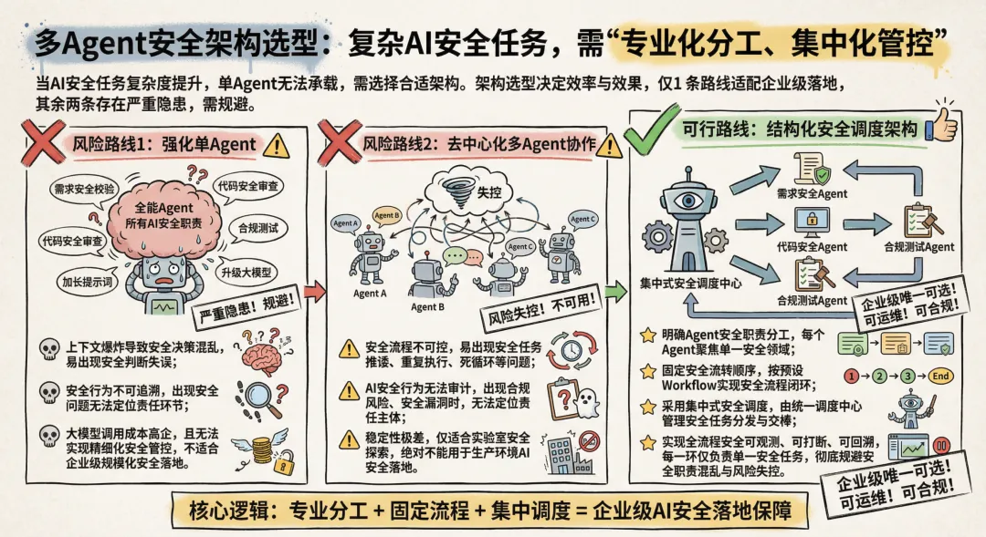 Harness体系实现AI安全合规落地的标志,是所有核心安全校验逻辑全部Scripts化。Rule与Skill依赖AI自觉执行,存在安全漏洞;而Scripts是机器可执行的安全校验代码,不掺杂任何主观因素,实现“安全校验不妥协、违规行为不放行”——代码存在安全漏洞→拦截,数据未脱敏→拦截,合规不达标→拦截,权限异常→拦截,无论AI如何规避,都无法绕过机器的强制安全校验。AI安全落地的成熟形态:Rule保留最基础的安全红线,Skill作为标准化安全执行模块,Scripts作为核心安全硬门禁,Workflow由Scripts驱动,所有Agent仅负责安全流程执行,不参与安全决策与校验。AI安全工程化的核心,不是依赖AI“自觉守安全”,而是通过Scripts构建不可突破的安全防线,实现AI安全行为的绝对可控、合规可审计。多Agent安全架构选型:复杂AI安全任务,需“专业化分工、集中化管控”