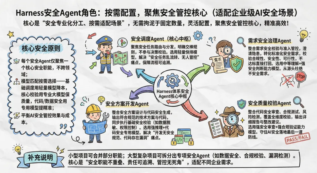 Harness体系中的安全Agent角色,核心是“安全专业化分工、按需适配场景”,无需拘泥于固定数量,而是根据企业AI安全落地规模、合规要求,灵活配置Agent角色,每个角色均对应具体的AI安全痛点,聚焦安全管控核心,避免资源浪费,同时确保安全管控精准高效。核心安全原则:每个安全Agent仅聚焦一个核心安全职能,不跨领域承担安全职责;模型匹配按需选择——基础安全调度类用轻量模型降本,核心安全校验、合规判断类用专业大模型保质量,代码安全、数据安全类用专用安全模型提升精准度,实现“角色-安全职能-模型”三者精准匹配,平衡AI安全管控效果与成本。结合企业级AI安全落地实践,核心安全Agent角色配置如下(可按需增减):- 安全调度Agent(核心中枢):聚焦安全任务路由与分发,明确各安全环节交棒规则,不参与任何安全决策与校验,选用轻量快排模型,确保AI安全流程有序流转,解决“安全任务乱流转、无人管控”的痛点,保障安全流程可追溯。