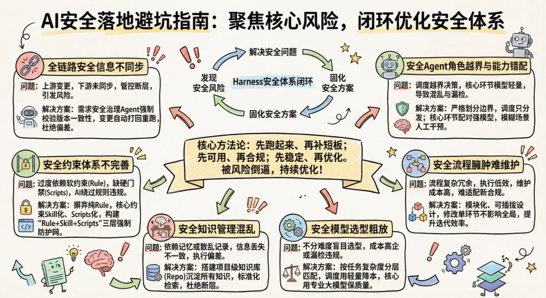 企业级AI安全落地,从来不是一次设计到位的,而是在实践中持续发现安全风险、解决安全问题,逐步补全安全短板、优化安全体系的过程。无需拘泥于固定迭代轮次,重点聚焦AI安全落地中的核心风险点,形成“发现安全风险-解决安全问题-固化安全方案”的闭环,就能快速搭建稳定、合规的Harness安全体系,以下是实践中最常见的核心安全坑点及可落地的解决方案:- 全链路安全信息不同步:上游安全需求变更后,下游方案、代码、安全校验文档未同步更新,导致安全管控出现断层,引发合规风险与安全漏洞。解决方案:通过需求安全治理Agent强制校验全链路安全版本一致性,任何上游安全需求变更,自动触发下游所有安全环节打回重跑,从流程上杜绝安全信息偏差,确保全链路安全管控同步。