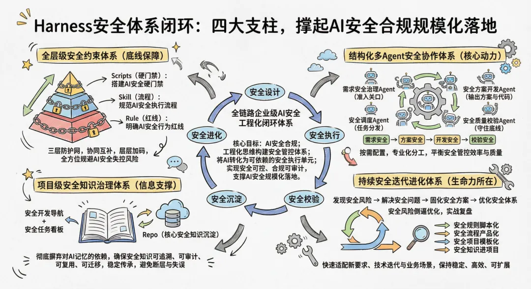 Harness Engineering不是零散的AI安全技巧,而是一套覆盖“安全设计-安全执行-安全校验-安全沉淀-安全进化”全链路的企业级AI安全工程化闭环体系。它以AI安全合规为核心目标,以工程化思维构建安全管控体系,将AI从“不可控的安全风险点”转化为“可依赖的安全执行单元”,核心价值在于通过架构设计与流程治理,让AI能力服务于业务需求的同时,实现安全可控、合规可审计,支撑AI安全规模化落地。Harness安全体系的四大核心支柱,相互支撑、协同发力,构建无死角的AI安全防护与高效管控机制,定义了企业级AI安全工程化的核心逻辑:- 全层级安全约束体系(底线保障):构建“Rule-Skill-Scripts”三层递进的安全约束架构,Rule明确AI安全行为红线,Skill规范AI安全执行流程,Scripts搭建AI安全硬门禁,三者协同互补、层层加码,形成AI安全执行的“三层防护网”,从基础约束到强制管控,全方位规避AI安全失控风险。