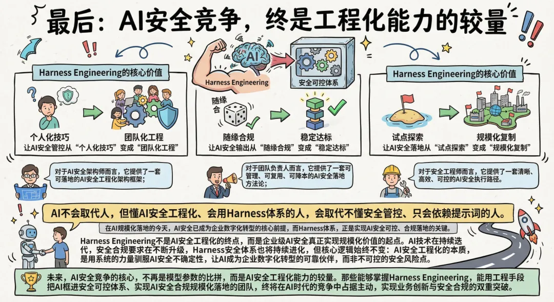 Harness Engineering的核心价值,是彻底解决企业级AI安全落地的核心痛点:让AI安全管控从“个人化技巧”变成“团队化工程”,让AI安全输出从“随缘合规”变成“稳定达标”,让AI安全落地从“试点探索”变成“规模化复制”。对于AI安全架构师而言,它提供了一套可落地的AI安全工程化架构框架;对于团队负责人而言,它提供了一套可管理、可复用、可降本的AI安全落地方法论;对于安全工程师而言,它提供了一套清晰、高效、可控的AI安全执行路径。AI不会取代人,但懂AI安全工程化、会用Harness体系的人,会取代不懂安全管控、只会依赖提示词的人。在AI规模化落地的今天,AI安全已成为企业数字化转型的核心前提,而Harness体系,正是实现AI安全可控、合规落地的关键。Harness Engineering不是AI安全工程化的终点,而是企业级AI安全真正实现规模化价值的起点。AI技术在持续迭代,安全合规要求在不断升级,Harness安全体系也将持续进化,但核心逻辑始终不变:AI安全工程化的本质,是用系统的力量驯服AI安全不确定性,让AI成为企业数字化转型的可靠伙伴,而非不可控的安全风险点。未来,AI安全竞争的核心,不再是模型参数的比拼,而是AI安全工程化能力的较量。那些能够掌握Harness Engineering,能用工程手段把AI框进安全可控体系、实现AI安全合规规模化落地的团队,终将在AI时代的竞争中占据主动,实现业务创新与安全合规的双重突破。