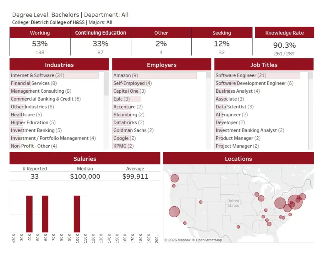 毕业生去向十分均衡,53%直接就业,33%继续深造。他们既有进入企业从事人文相关岗位的,也有继续深耕学术领域的,成功打破了“人文专业薪资低”的刻板印象。这得益于CMU注重将人文社科与统计、数据分析等相结合,培养了学生的复合型能力,使他们在就业市场上更具竞争力。