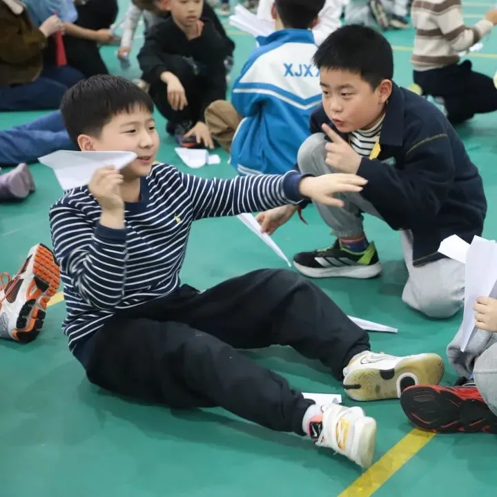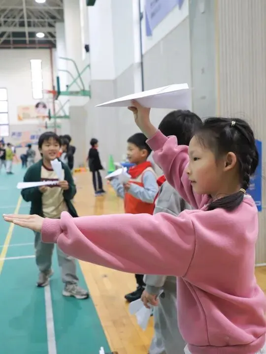 纸飞机挑战赛的赛场,欢呼声此起彼伏。1-3 年级比拼直线投掷距离,4-6 年级角逐空中留空时长,一张张普通 A4 纸,在孩子们巧手中变成灵动的纸飞机,迎着风飞向远方,也飞出了童年的快乐与梦想。