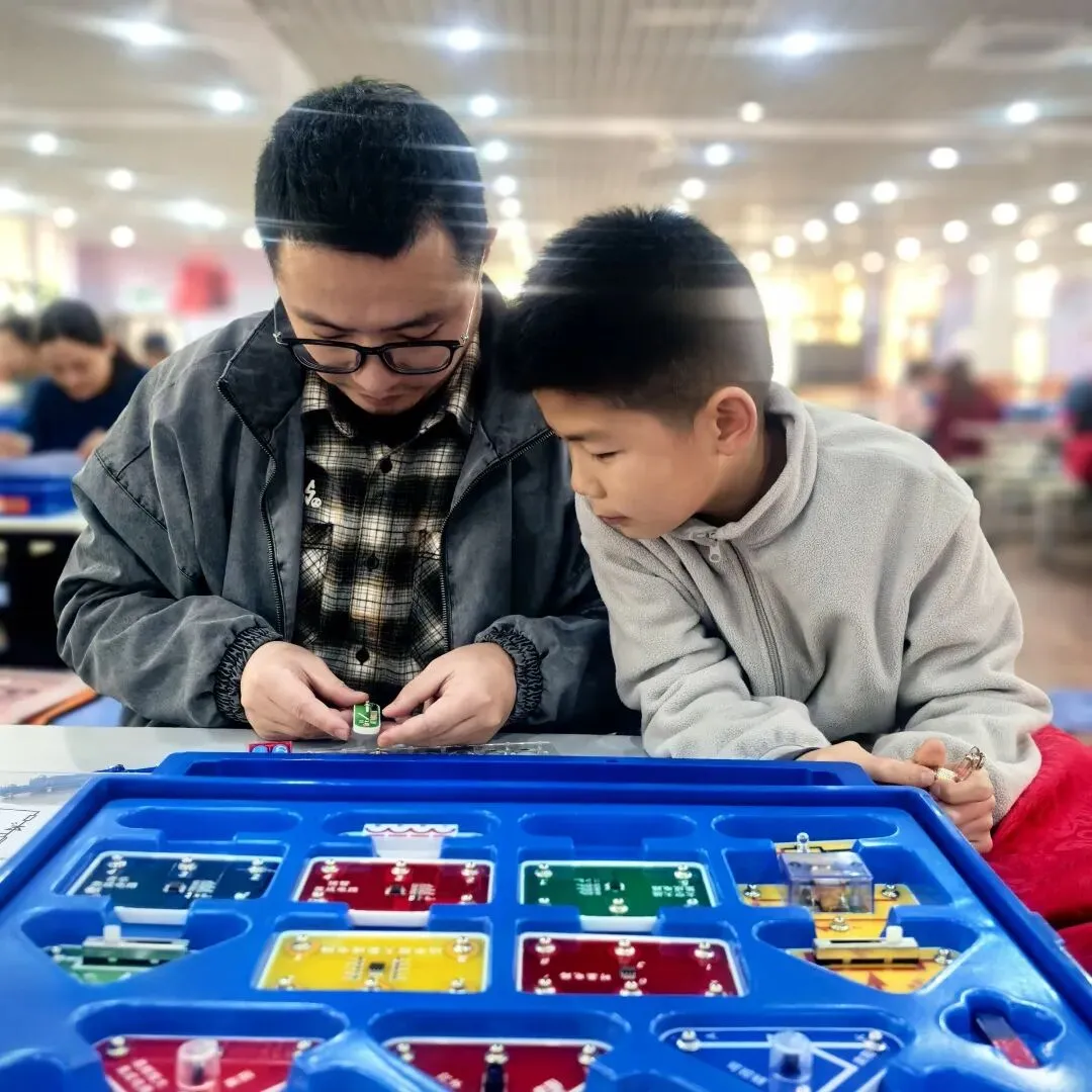 电子百拼亲子赛现场,家长与孩子默契配合、手脑并用拼搭电路,在分工协作中完成挑战,收获科学知识的同时,更增进了亲子情谊。