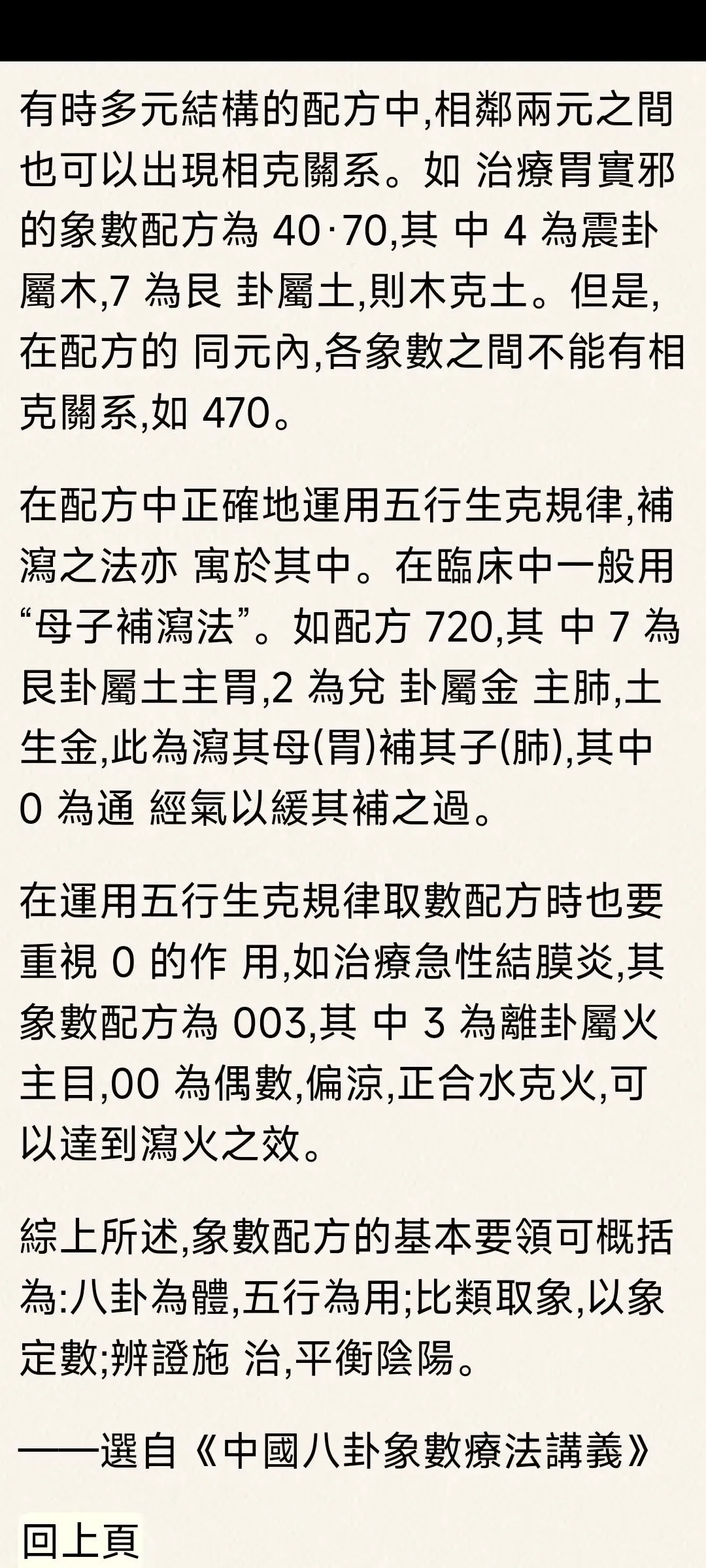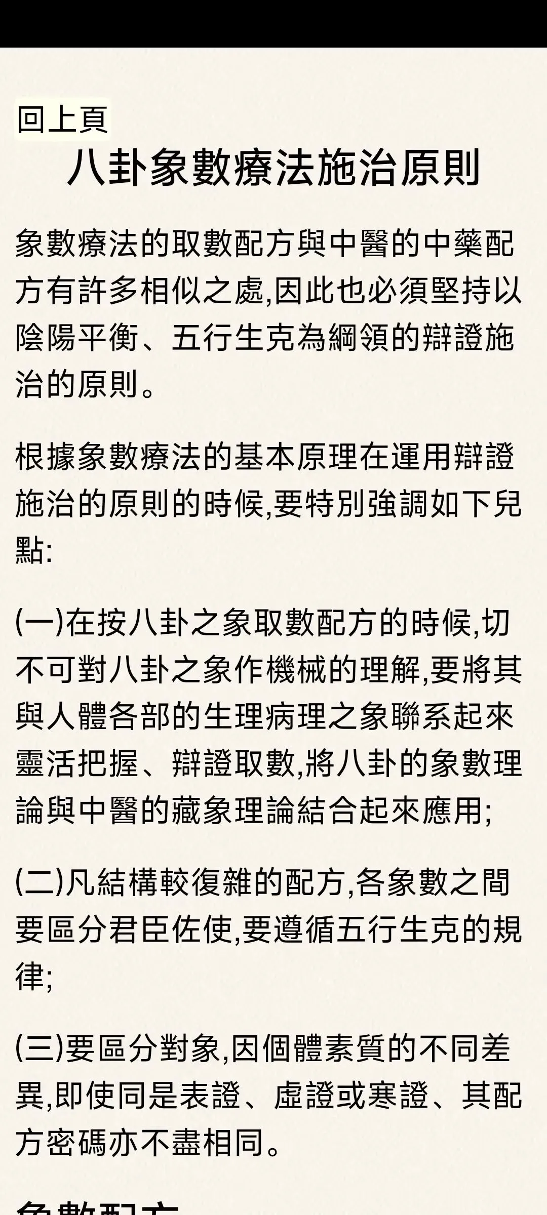 象数治疗主要通过默念数字,以数字息波的能量通经气调阴阳,以达到治疗效果。象數療法的取數配方與中醫的中藥配方有許多相似之處,因此也必須堅持以陰陽平衡、五行生克為綱領的辯證施治的原則。根據象數療法的基本原理在運用辯證施治。